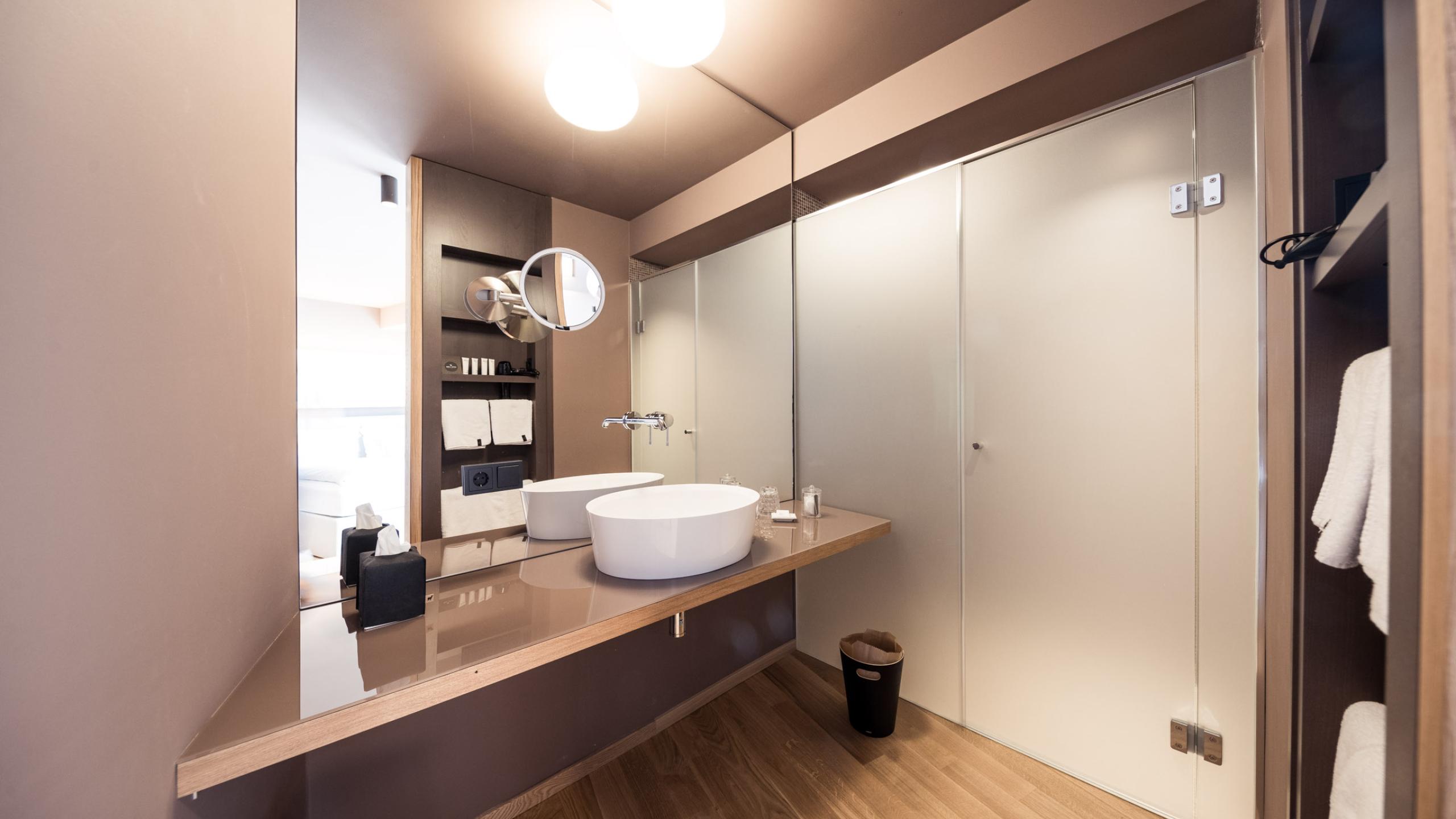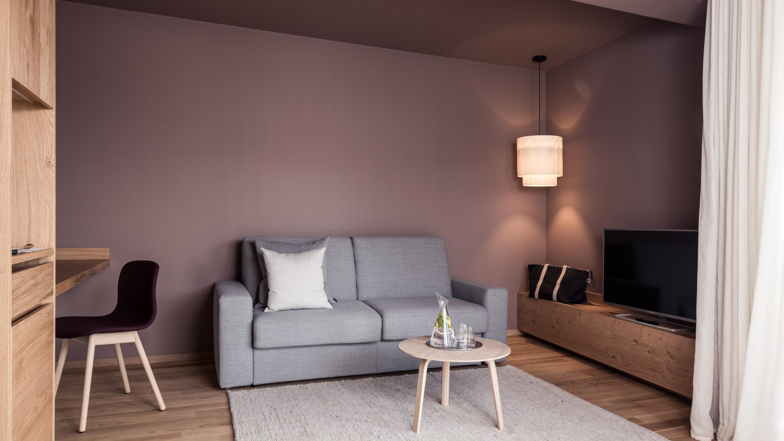 Luxurious suite with balcony-loggia, free-standing bathtube in the room and separate living-/bedroom. Wooden floor from premium oak, extra-large box-spring-bed (210 x 200 cm), lounge corner with pull-out sofa, reading table, bio air-conditioning, flat-screen sat-TV, Wi-Fi, telephone, safe and minibar, bathroom with large wellness shower and hairdryer, separate WC with bidet, spa bag with bathrobe and slippers as well as one parking space in the underground garage per room. Ideal for couples.