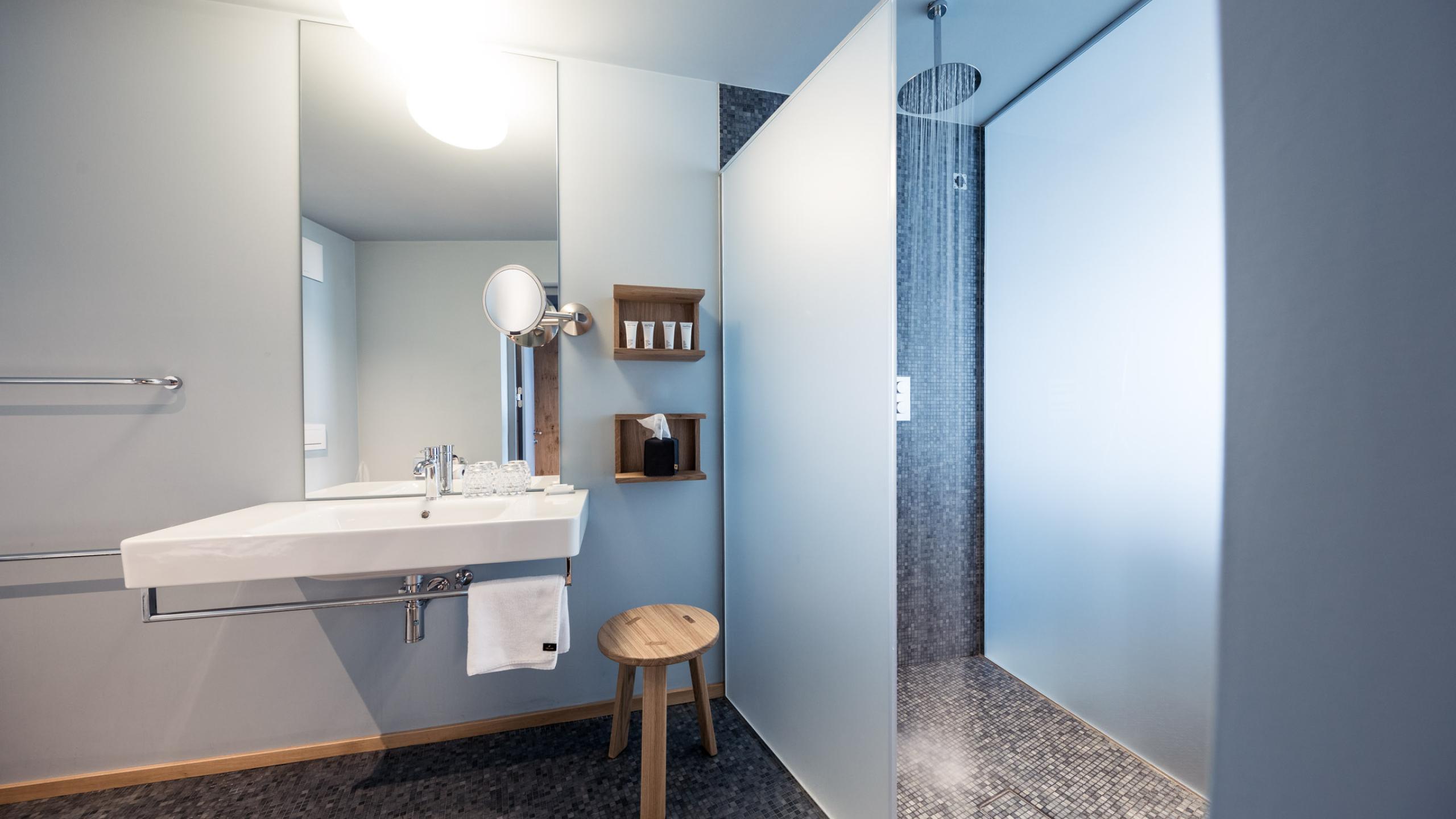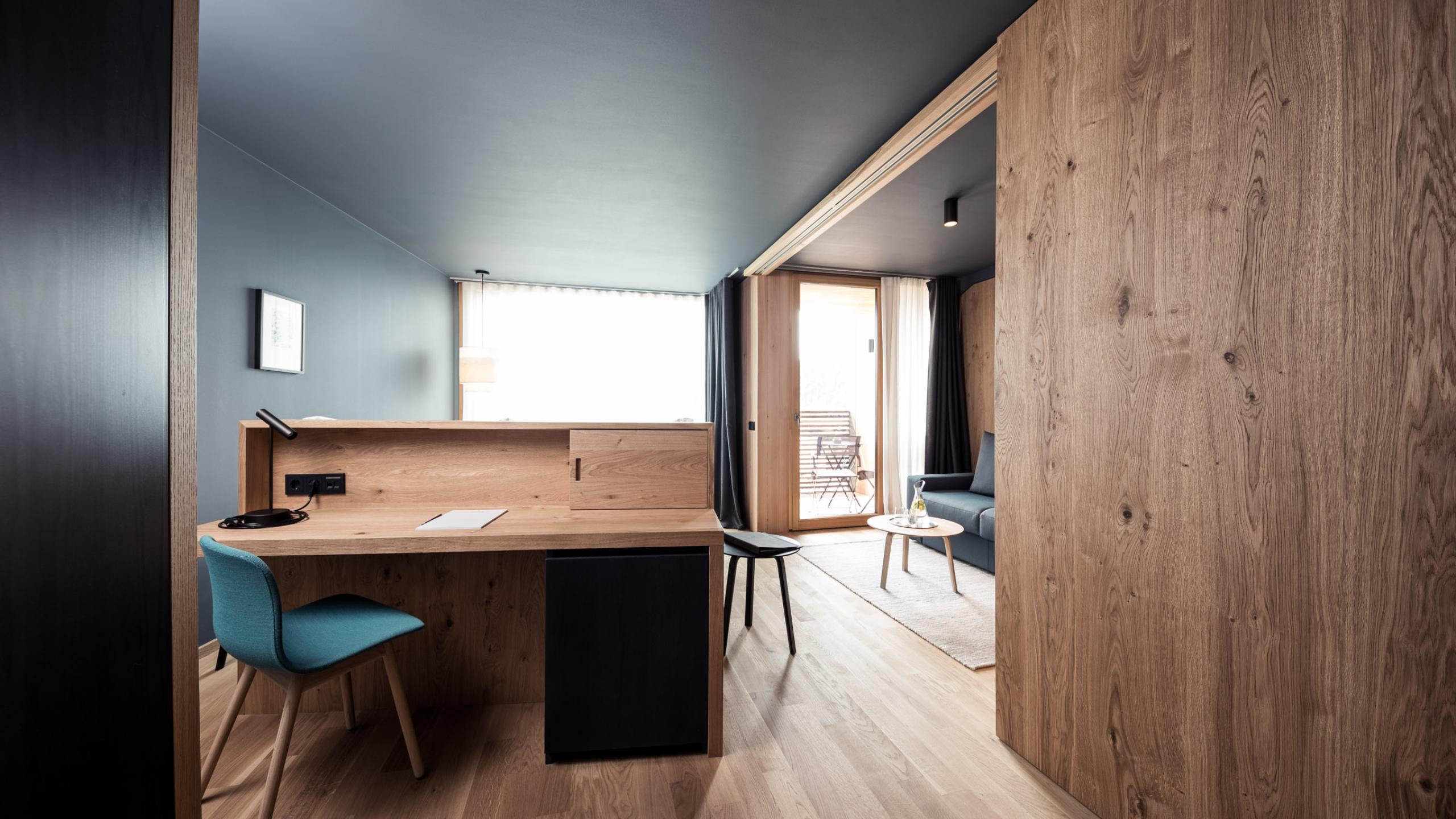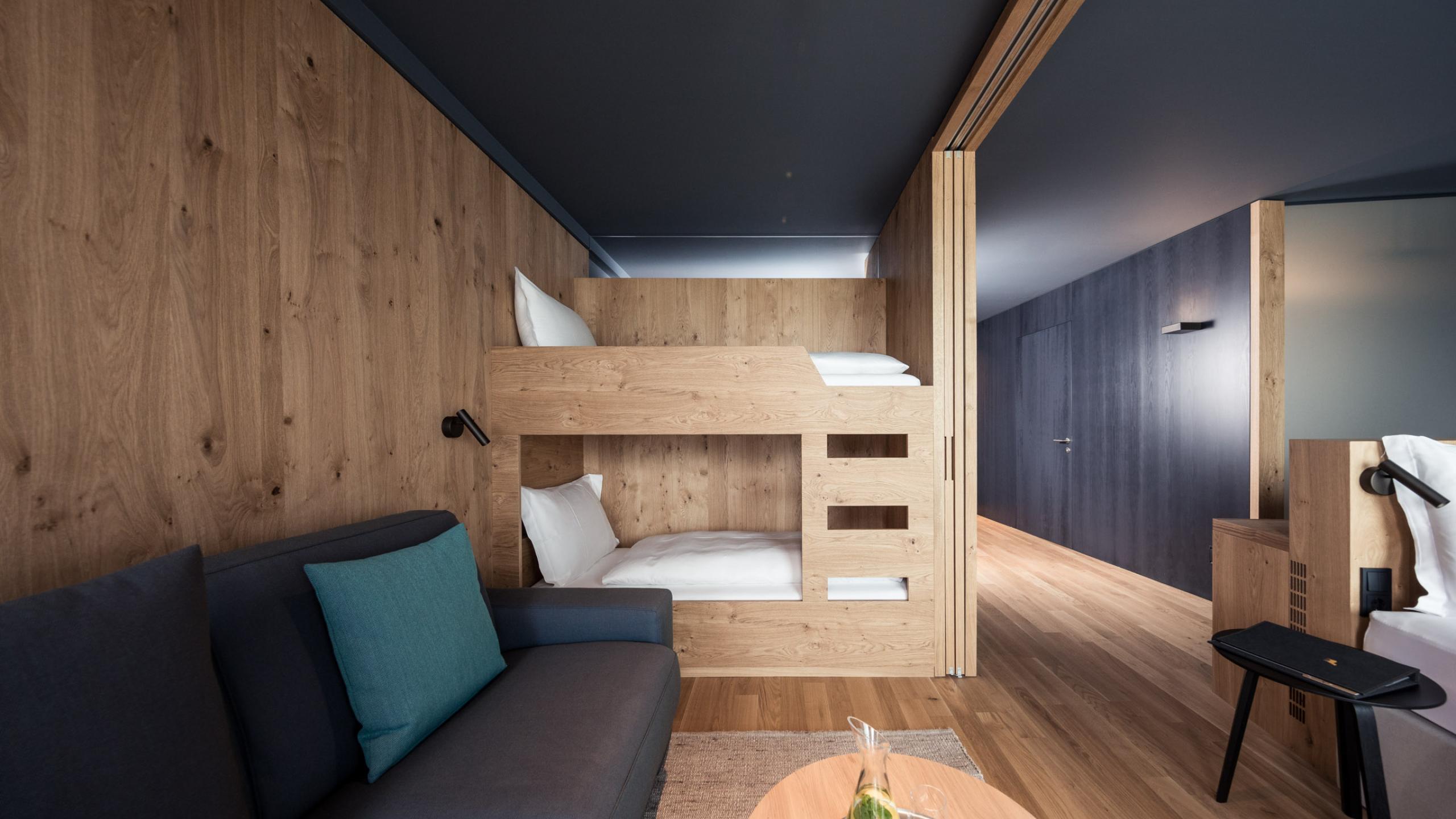 Großzügige Suite mit Balkon-Loggia und zwei getrennten Schlafzimmern durch eine Schiebetür. Holzboden aus hochwertiger Eiche, komfortables Boxspringdoppelbett , Wohnbereich mit gemütlicher Couch, Lesetisch, Bio-Heiz-Kühldecke, Flat-SAT-TV, WLAN, Telefon, Safe und Minibar, einem Badezimmer mit großer Wellnessdusche, WC, Bidet und Föhn, Wellnesstasche mit Bademantel und Handtüchern für Bad und Sauna sowie Tiefgaragenplatz pro Zimmer. Ideal für Familien mit Kindern oder für drei bis vier Freunde.